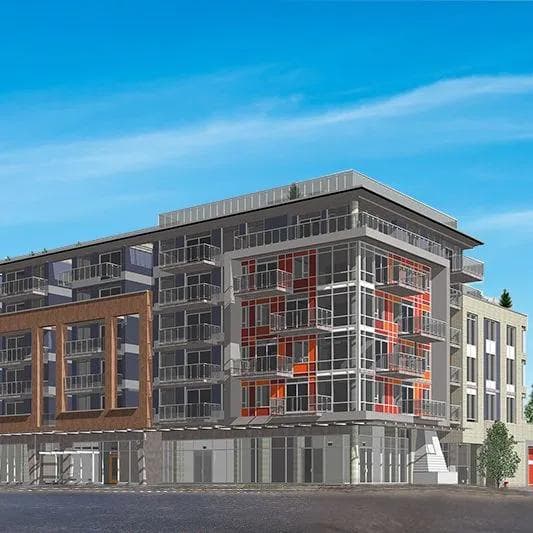 Six-storey wood-frame low-rise in East Vancouver delivering 91 rental apartments plus retail, with modern curtain-wall glazing, storefronts, aluminum doors and glass canopy by Sky Windows.